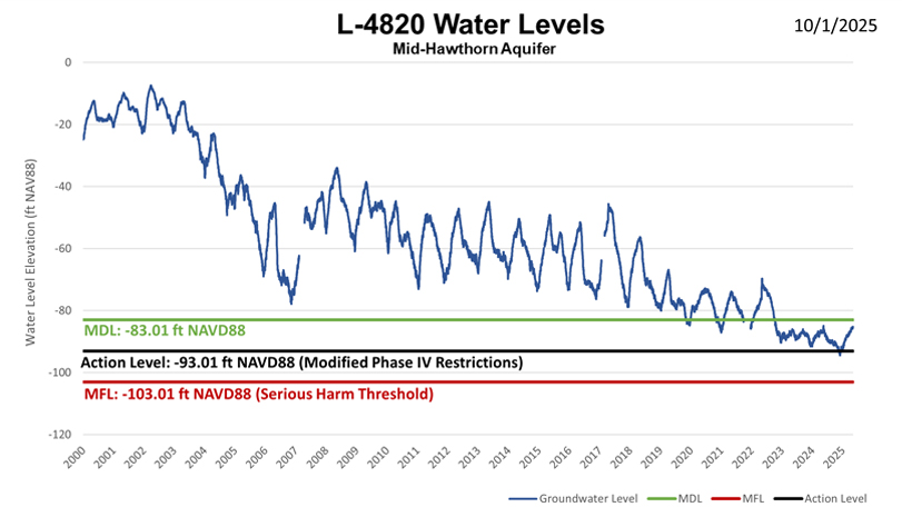 In order to continue to protect groundwater in the Mid-Hawthorn Aquifer, the South Florida Water Management District (District) still has a Water Shortage Order imposing Modified Phase IV Water Shortage restrictions in a designated area of Northeastern Cape Coral in Lee County for residents and businesses that use private wells for irrigation. This restriction does not apply to homes and businesses on city water.As of October 1, 2025, the water level at the USGS Monitoring Well L-4820 in the water shortage area has increased to -85.14 feet (NAVD) or about 9 feet since record low levels in April. This increase is the result of the restrictions that were put in place. As a reminder, if the water level falls below -103.01 feet NAVD, serious and possibly irreversible harm may be caused to the aquifer.