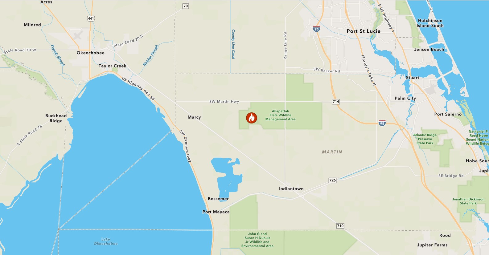 The South Florida Water Management District plans to conduct a 300-acre prescribed burn in the Allapattah Flats Management Area in western Martin County today, Tuesday, December 23, 2025. The burn unit is located approximately 1.5 miles south of SW Martin Highway and 1.25 miles west of SW Fox Brown Road. Smoke may be visible in the area of the burn as identified in the mapĀ here.